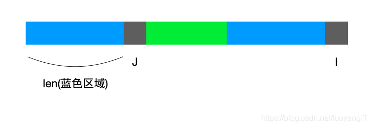已知蓝色区域相等且长度都为len,那么很明显,next[i] == len,若此时模式串pattern[i] != pattern[j](两个灰色区域不相等)。那么看下图: