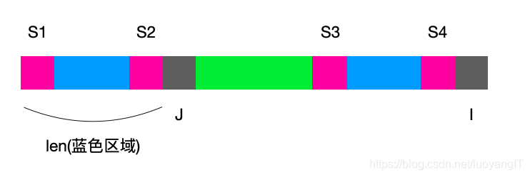 若此时next[j] == len(粉色部分)那么S1==S2,又因为next[i] == next[j],所以S1==S3 且 S3 == S4,则可以推出S1 == S4,这样我们就利用前面所获得的信息,推出了S1 == S4这个信息,然后将J移动到S1后一格,只要再次比较patter[i] 与 patter[j]的相等情况,就可以得出next[i+1]的值。这里因为i始终向后移动,所以也是线性时间复杂度的算法。