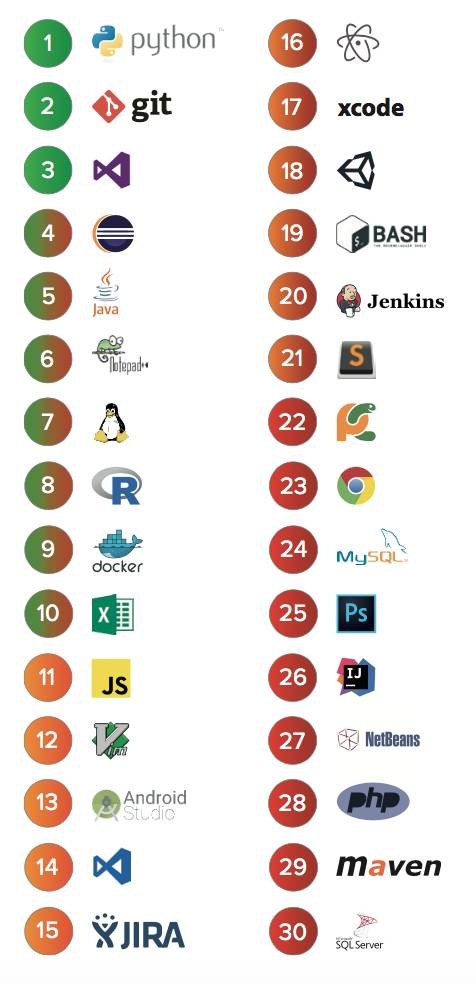 此外,在后续(未来3个月)最想学习的工具的调查中,Python 依然坚挺的排在第二位。第一名是 Docker,随后依次是 Angular、Visual Studio 和 Jenkins 。