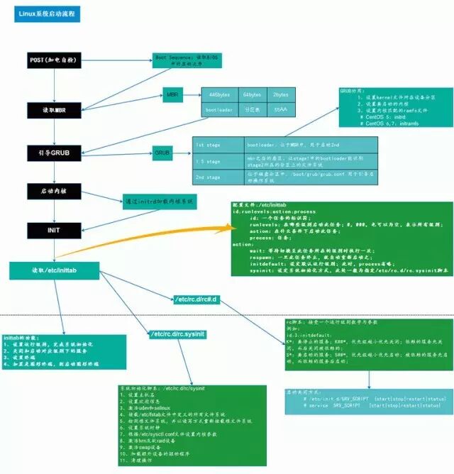 POST(加点自检)-->Boot Sequence(BIOS:基本输入输出系统)-->Boot Loader(MBR:主引导记录)-->Kernel(ramdisk)-->rootfs(根文件系统)-->switchchroot-->/sbin/init/(/etc/inittab /etc/init/*.conf)-->设定运行级别-->系统初始化脚本-->关闭启动相应服务-->启动终端