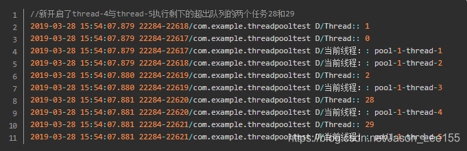 demo中设置的任务队列长度为100,所以不会开启额外的5-3=2个非核心线程,如果将任务队列设为25,则前三个任务被核心线程执行,剩下的30-3=27个任务进入队列会满,此时会开启2个非核心线程来执行剩下的两个任务。