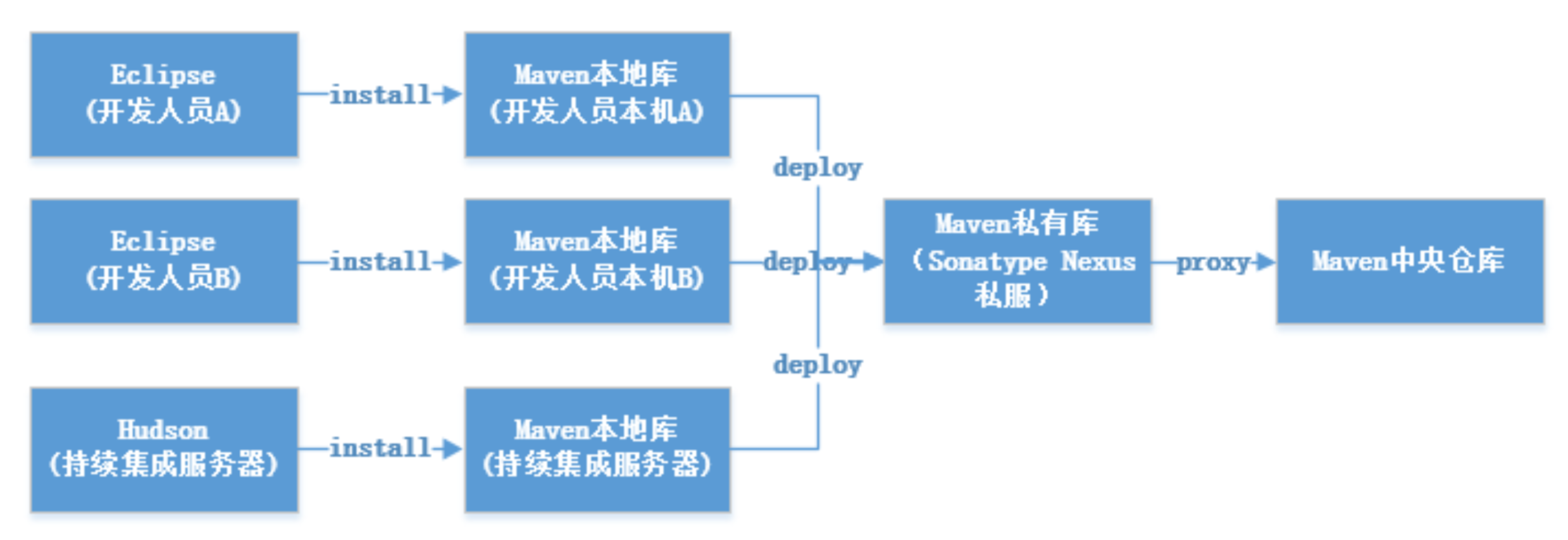 如果 Nexus 私服也没有此依赖包,就回去远程中央仓库下载依赖,这些中央仓库就是 proxy。 Nexus 私服下载成功后再下载至本地 Maven 库供项目引用。