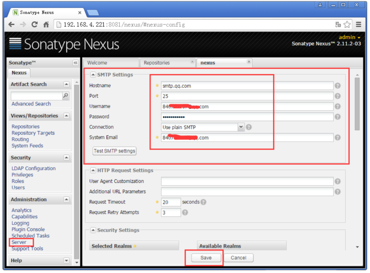1、菜单 Administration/Server 配置邮箱服务地址(如果忘记密码,可以通过该邮箱找回密 码)