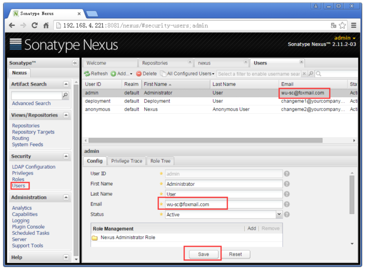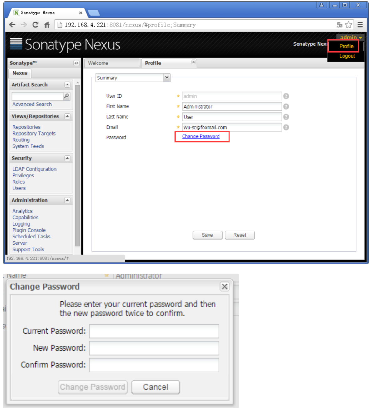 之后退出后再次进入nexus==>输入username和e-mail(刚刚新设置的email)即可重新登录