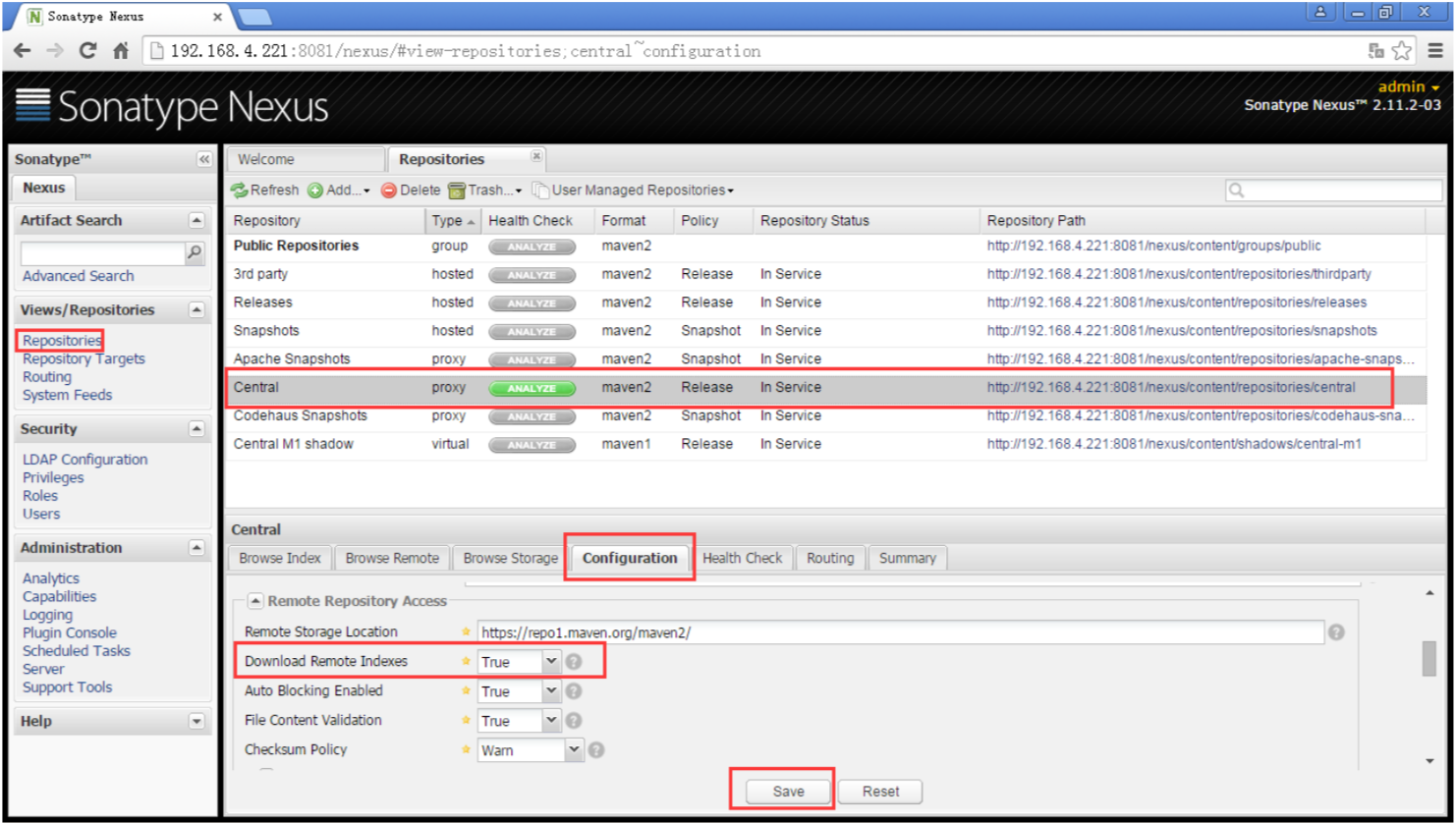 3、设置 proxy 代理仓库(Apache Snapshots/Central/Codehaus Snapshots)准许远程下载, 如: