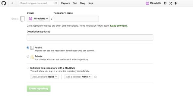 接下来就可以上传你的代码了,在github下建立自己的Repository。Create a new Repository如下: