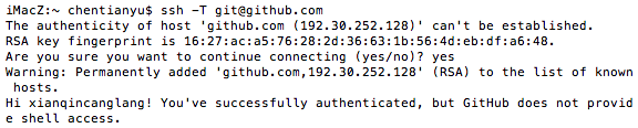 打开终端,先测试一下你的账号跟github连上没有:ssh -T git@github.com