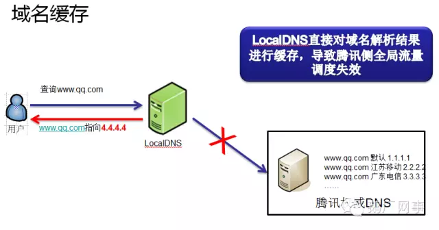 域名缓存很好理解,就是LocalDNS缓存了腾讯的域名的解析结果,不向腾讯权威DNS发起递归,示意图如下: