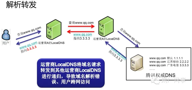 而部分小运营商为了节省资源,就直接将解析请求转发到了其它运营的递归LocalDNS上去了: