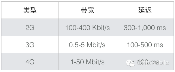 带宽和延迟是影响网络服务性能的两个因素,带宽受网络通道上最小带宽的网段限制,延迟是网络包在客户端和服务端之间的来回传输时长,不同网络类型上的带宽和延迟差别非常大(见下图)。