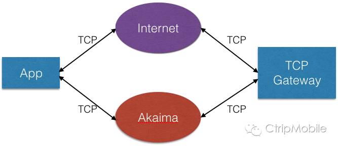携程目前没有部署海外IDC,海外用户在使用App时需要访问位于国内的IDC,服务平均耗时明显高于国内用户。我们采用了名为『TCP Bypass for Oversea』的技术方案来优化海外网络服务性能,主要是使用了Akaima的海外专属网络通道,同时在携程国内IDC部署了局端设备,使用专用加速通道的方式来提升海外用户体验。