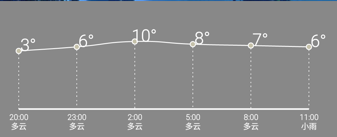 由于需要动态添加数据,也就是温度,这里我设置了6个时段的温度,每个时段三个小时。在setChartDataSet方法中添加了参数,dataSeries1.getLinePaint().setStrokeWidth(3);设置了绘制曲线的线宽度,dataSeries1.setLineStyle(XEnum.LineStyle.DASH)设置了曲线的类型。setChartLabels(List<String> weather)设置了横轴坐标表示什么意思,在这里表示时段和天气状态。