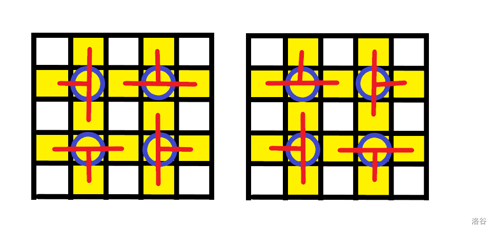 我们发现,对于一个中心,如果可以,我们有 \(4\) 种放置方式。而当我们放置一个积木后,可能会导致周围的中心格子积木的放置方式变少。因为不能重叠。