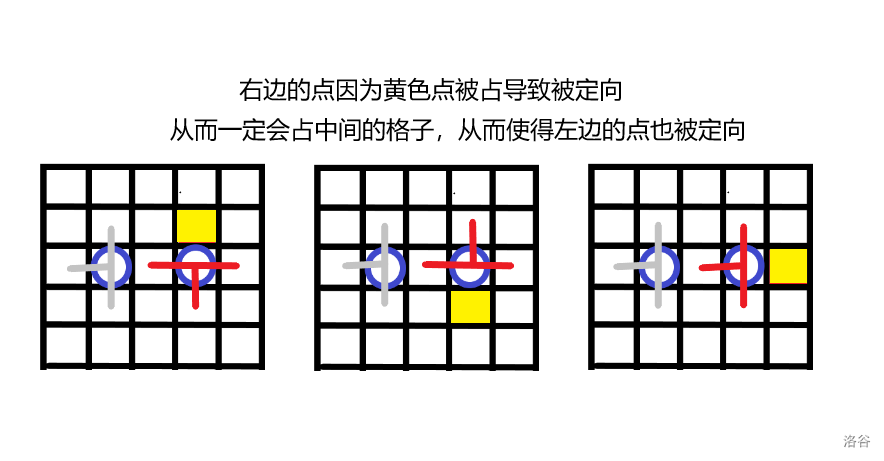 如果其中有且仅有一个被定向了,那么另一个也会被跟着定向。可以理解为 定向的传导。因为中间的格子是空的,所以被定向的格子一定是因为黄色格子被占而导致该格子放置时一定占了二者中间的位置。从而导致另一个格子也被定向。