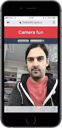 保存文件,重新加载页面然后点击按钮。你应该能看到一个权限对话框请求访问你的摄像头,一旦授权屏幕上就应该会出现视频。在你的电脑和手机上试一试,我在我的 iPhone 上试了,被选择的是前置摄像头。