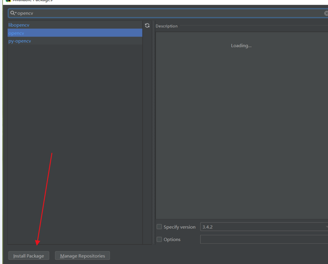 5.在其中搜索需要安装的库(这里以opencv为例),搜索到之后点击Install Package,,之后耐心等待就好了: