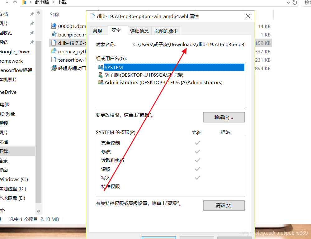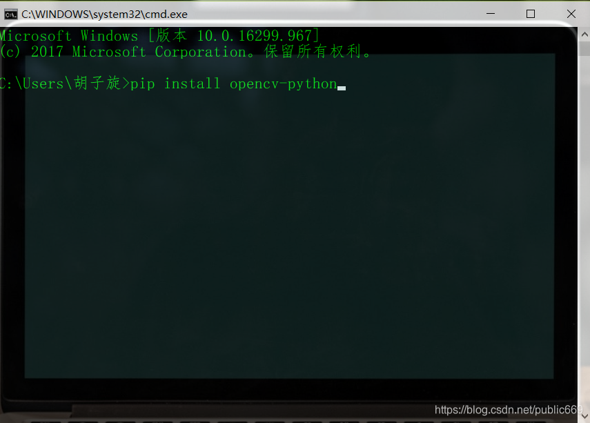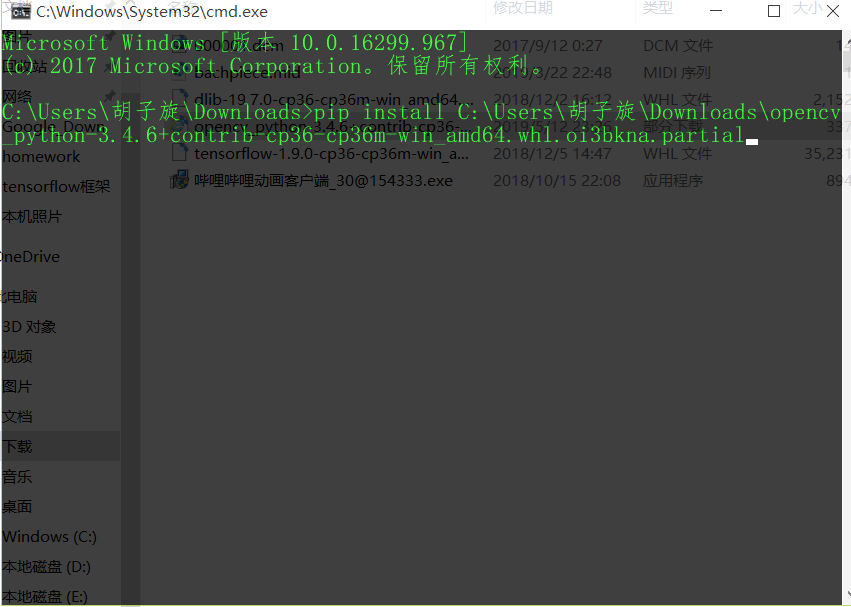 则输入的命令就为:pip install C:\Users\胡子旋\Downloads\opencv_python-3.4.6+contrib-cp36-cp36m-win_amd64.whl.oi3bkna.partial