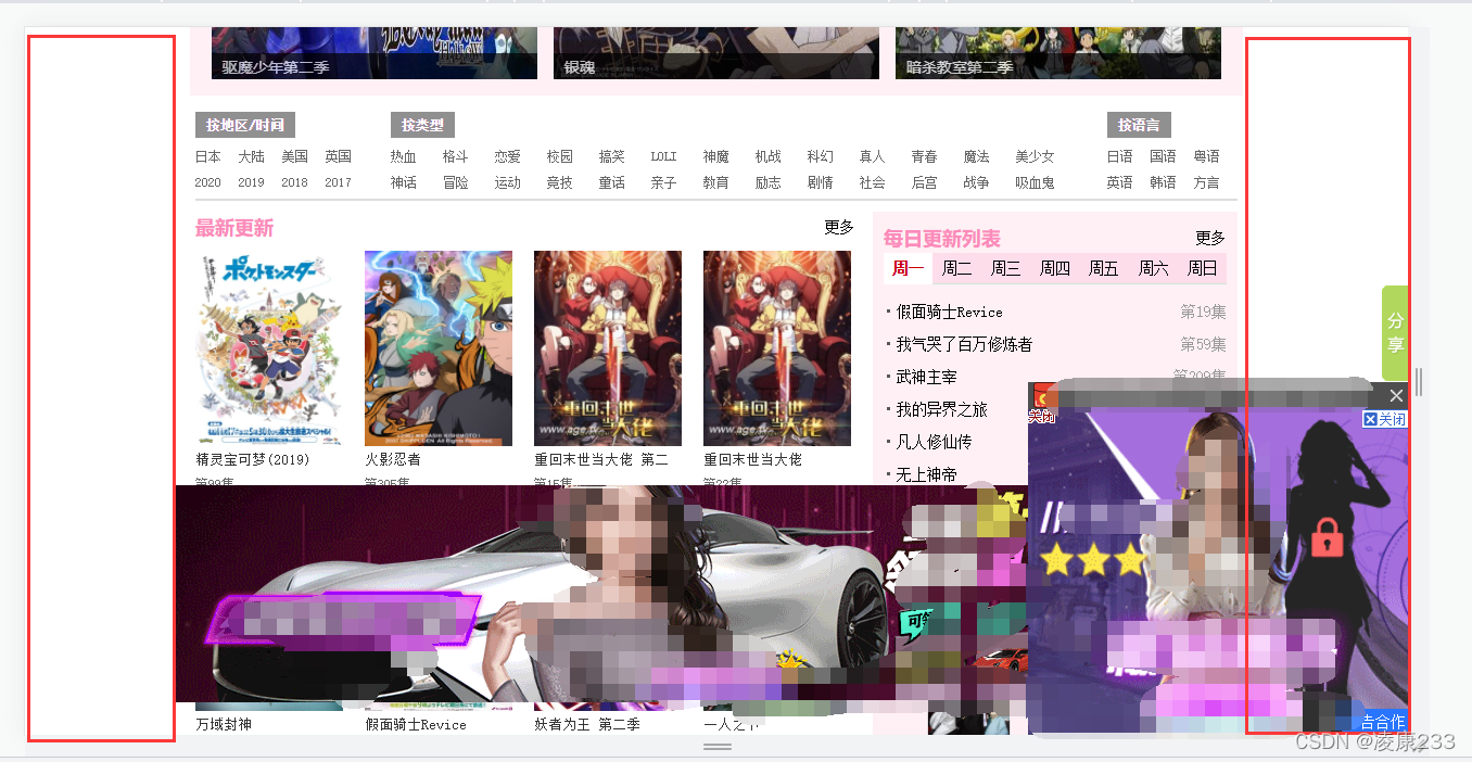 实现了上面的场景是不是和某些免费网站一样呢?左边是渣渣辉砍一刀广告,右边是美女秘书养成游戏,中间就是无修xx。