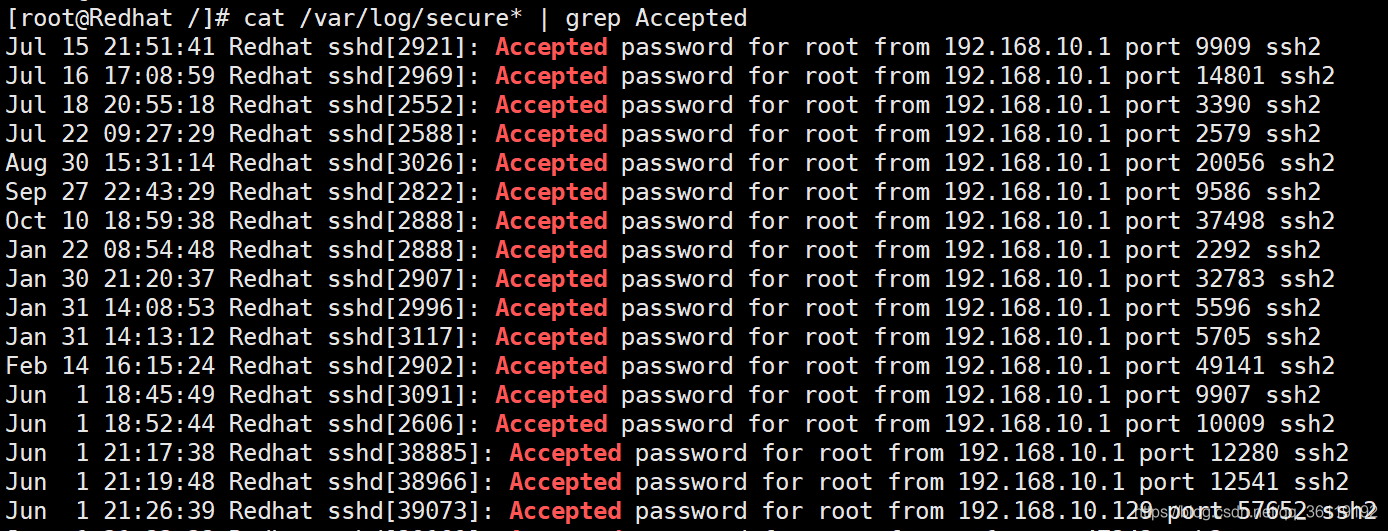 cat /var/log/secure* | grep Accepted #查看登录成功的记录