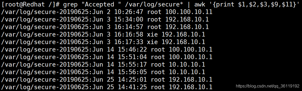 grep "Accepted " /var/log/secure* | awk '{print $1,$2,$3,$9,$11}' #查看登录成功的日期、用户名及ip