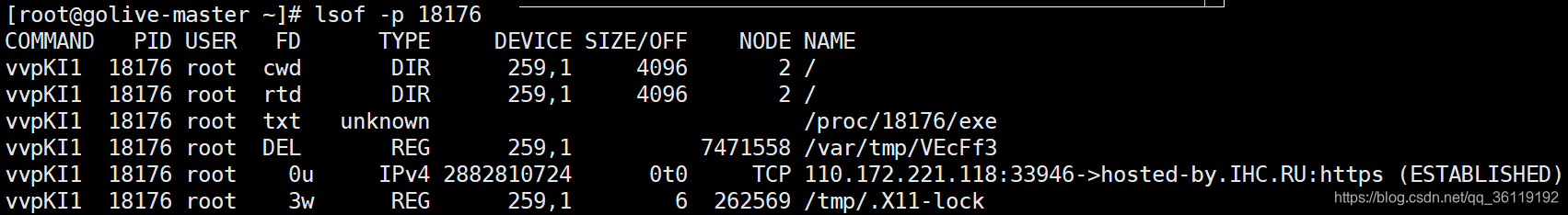 由上面我们可知,恶意进程的 PID 为 18176,进程占用的本地端口是33946,进程名字为 vvpKI1