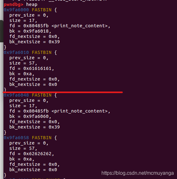 用printf打印一个堆块看一下内容,可以看到打印出了add创建的第二个chunk里的值