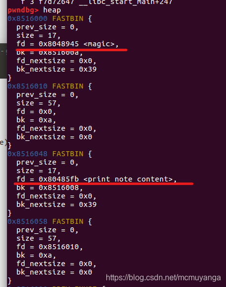 可以看到我们新建的chunk由0x8516048和0x8516010构成,我们现在进行printf的话就会跳转到后门函数,就获取了shell