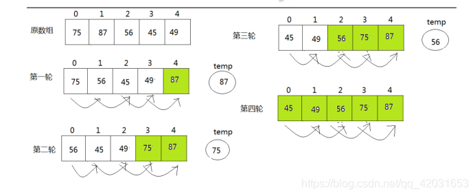3) 如果前一个元素大于后一个元素,则使用第三变量交换