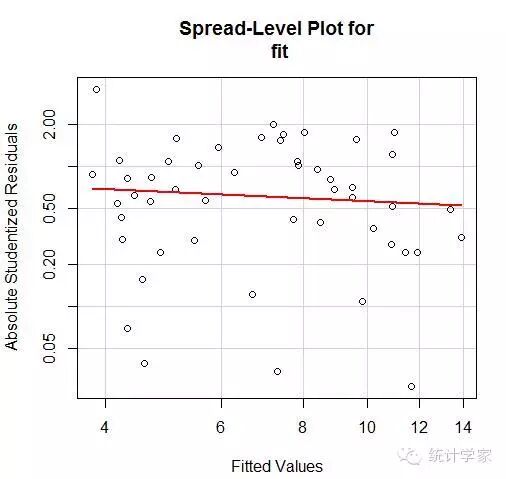 ncvTest()函数生成一个计分检验,零假设为误差方差不变,备择假设为误差方差随着拟合值水平的变化而变化。若检验显著,则说明存在异方差性(误差方差不恒定)。spreadLevelPlot()函数创建一个添加了最佳拟合曲线的散点图,展示标准化残差绝对值与拟合值的关系