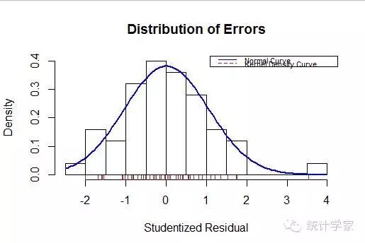 口线性若因变量与自变量线性相关,那么残差值与预测(拟合)值就没有任何系统关联。换句话说,除了自噪声,模型应该包含数据中所有的系统方差。在“残差图与拟合图”( Residuals vs Fitted,左上)中可以清楚的看到一个曲线关系,这暗示着你可能需要对回归模型加上一个二次项。