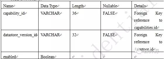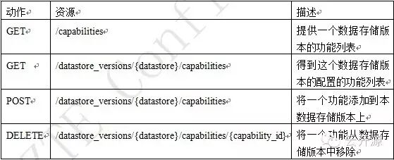 Add a capability to a datastore version请求消息结构:{ "capability_id": "550e8400-e29b-41d4-a716-446655440000"}应答消息结构:{ "capabilities": { [ { "id": "550e8400-e29b-41d4-a716-446655440000", "name": "Volume Support", "description": "If enabled, a cinder volume will be created and attached to the database server" } ] }}Delete Capabilities (DELETE)DELETE /capabilities/{capability_id}Response200 OK No body