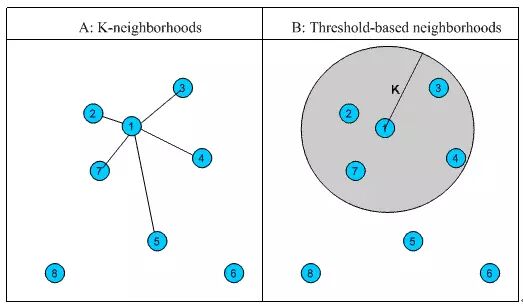 与计算固定数量的邻居的原则不同,基于相似度门槛的邻居计算是对邻居的远近进行最大值的限制,落在以当前点为中心,距离为 K 的区域中的所有点都作为当前点的邻居,这种方法计算得到的邻居个数不确定,但相似度不会出现较大的误差。如图 1 中的 B,从点 1 出发,计算相似度在 K 内的邻居,得到点 2,点 3,点 4 和点 7,这种方法计算出的邻居的相似度程度比前一种优,尤其是对孤立点的处理。