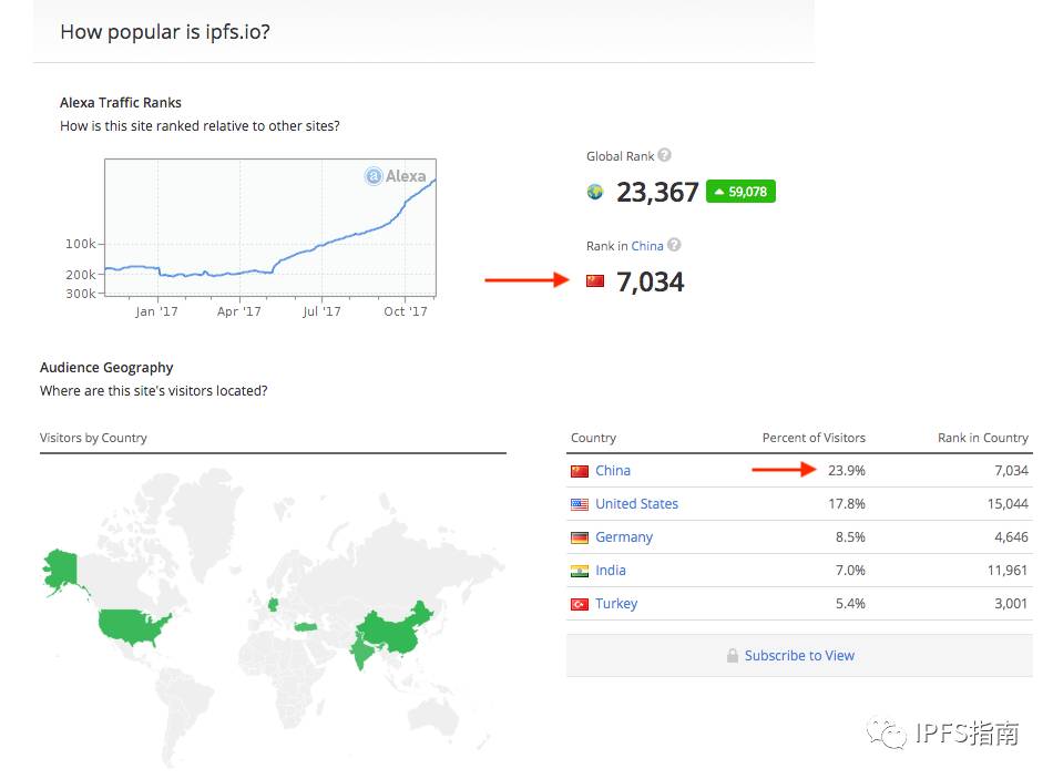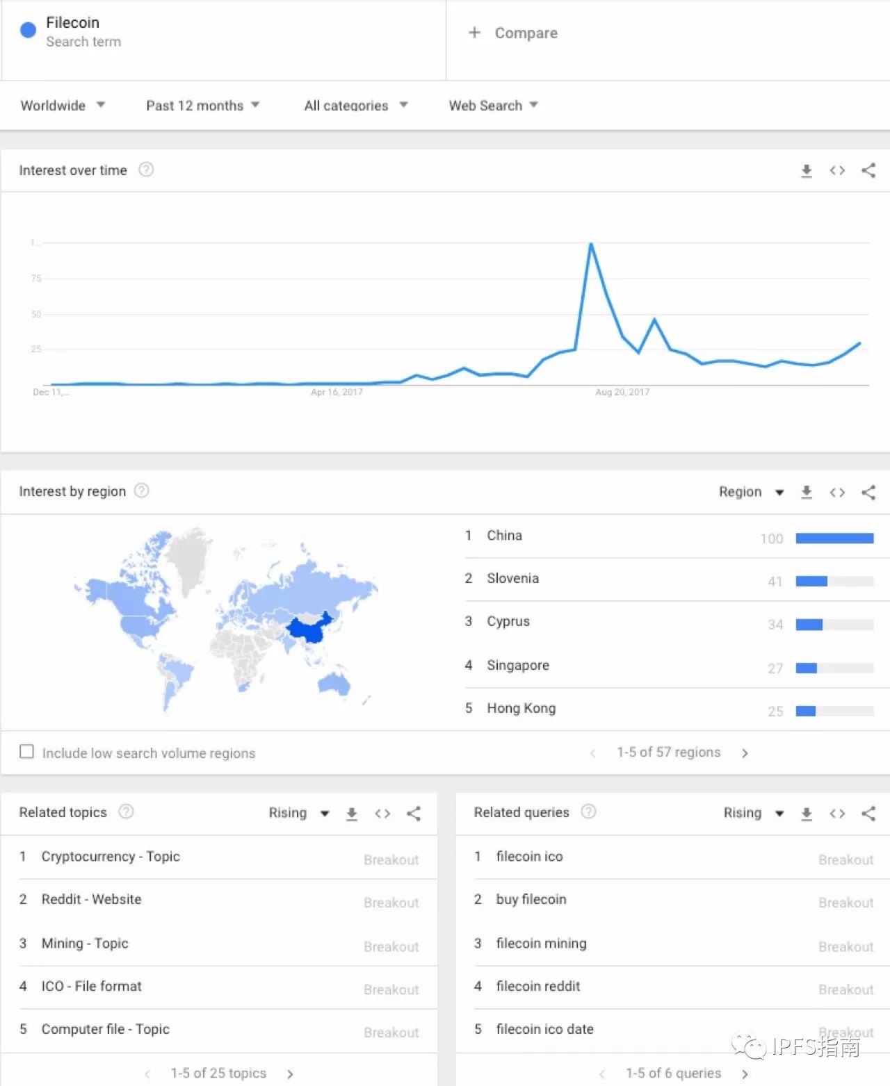 前两个图是Google趋势:IPFS和Filecoin。其中Filecoin的趋势图中有一个峰值,那是来自于ICO,总体趋势可以看出IPFS正在稳步的走入人们的视线。