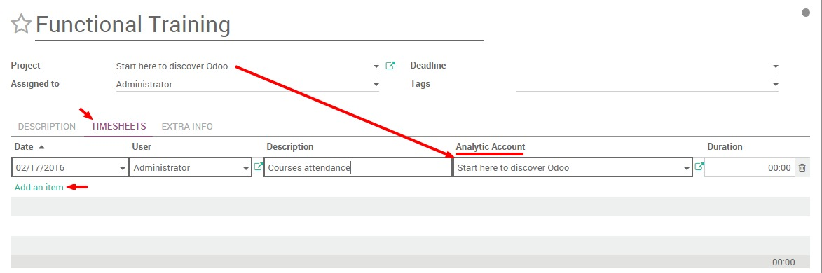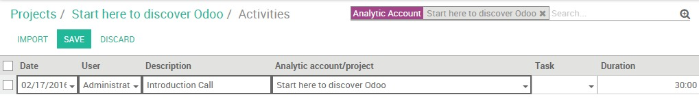 在Odoo工时单。点击创建, 一个带有今天的日期和时间的行会出现。项目名称被自动选择为分析帐号。没有任务设置, 您可以选择是否添加一个特定的任务。