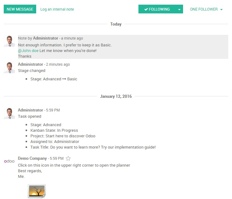 在一个任务中, 你可以添加其他用户作为 关注者 。添加一个关注者意味着当任务有任何变更时这个人会被通知到。目的是允许来自谈话的外部贡献。当你需要从其他部门同事的意见时这是非常宝贵的。你也可以邀请客户参与部分任务, 他们会被邮件通知, 并通过回复邮件来参与任务。关注者可以像你一样看到整个任务的描述和交谈。