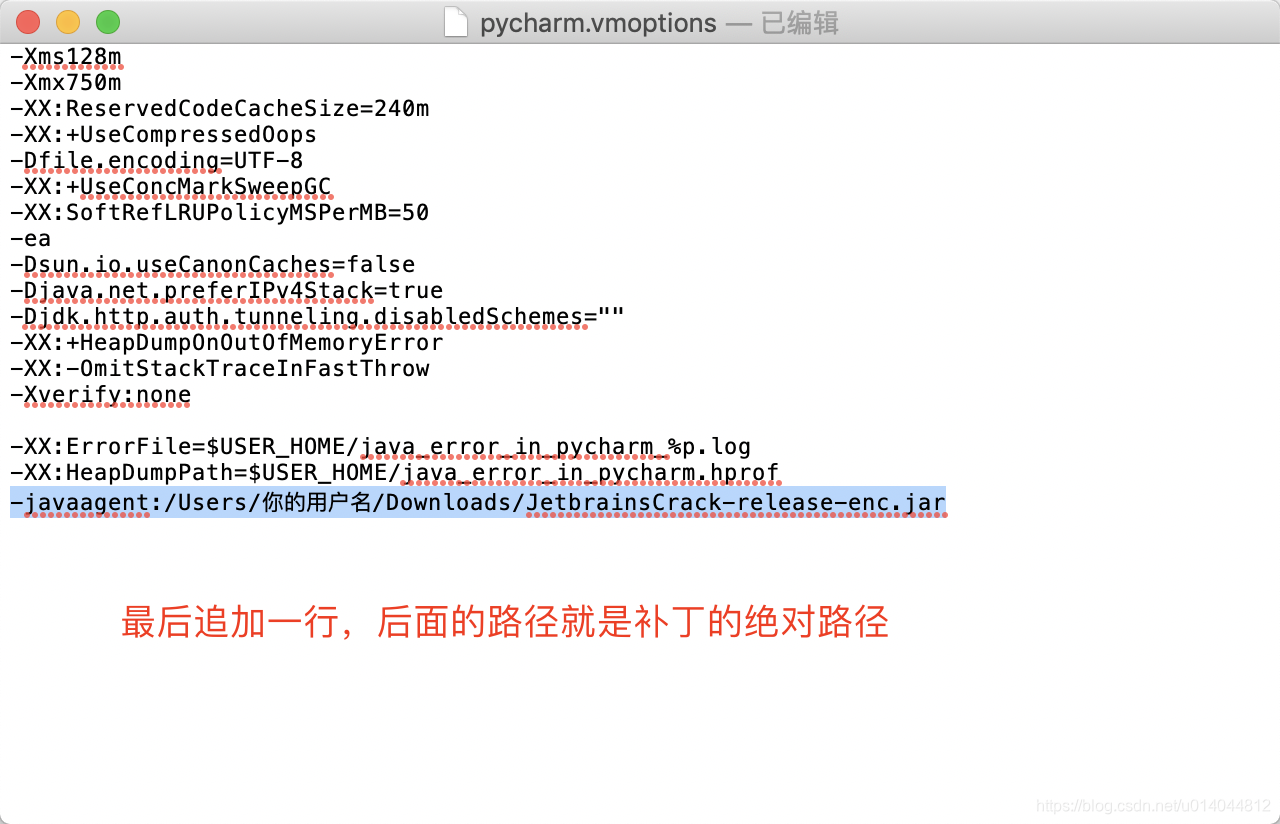 在文件最后追加一行:-javaagent:/Users/你的用户名/Downloads/JetbrainsCrack-release-enc.jar