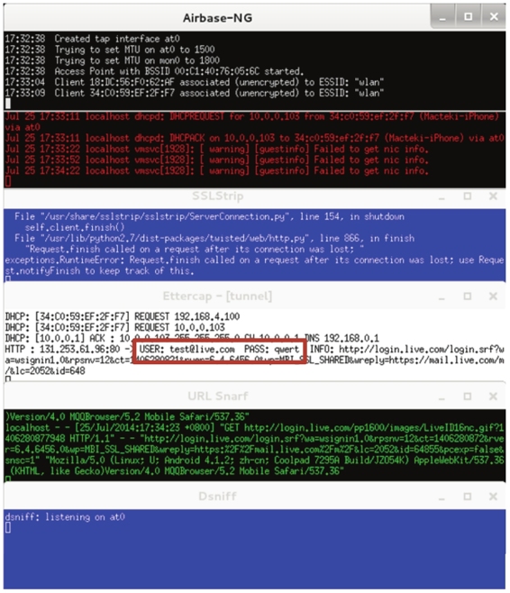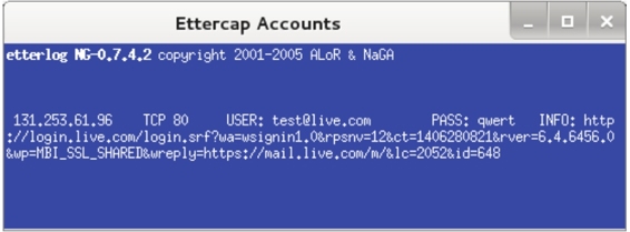 (4)当有用户连接Wifi接入点时,Easy-Creds将自动给客户端分配一个IP地址,并且能够访问互联网。如果在互联网上访问一个安全网址时,该工具将除去SSL并删除安全连接并在后台运行。所以,能够读取到客户端登录某个网站的用户名和密码。如图9.34所示,捕获到一个登录http://www.live.com网站的用户名和密码。其用户名为test@live.com,密码为qwert。