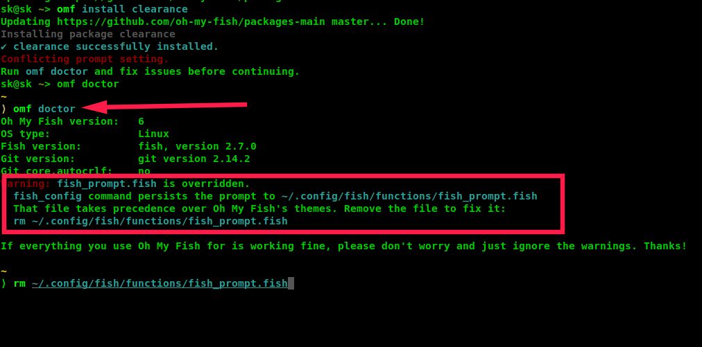 如果出现了错误,omf 足够聪明来帮助你,它可以列出解决问题的方法。例如,我安装了 clearance 包,得到了文件冲突的错误。幸运的是,在继续之前,Oh My Fish 会指示我该怎么做。因此,我只是简单地运行了以下代码来了解如何修正错误。