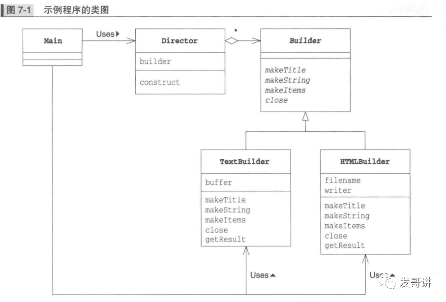 ConcreteBuilder角色是负责实现Builder角色的接口的类(API)。这里定义了在生成实例时实际被调用的方法。此外,在ConcreteBuilder角色中还定义了获取最终生成结果的方法。在示例程序中,由TextBuilder类和HTMLBui lder类扮演此角色。