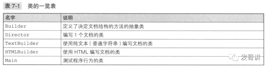 Builder角色负责定义用于生成实例的接口( API )。Builder 角色中准备了用于生成实例的方法。在示例程序中,由Builder类扮演此角色。