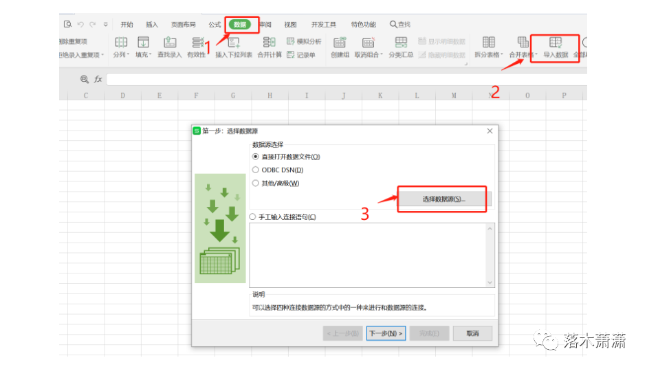 第二步:“WPS表格”的【数据】菜单项——>点击【导入数据】功能处弹出相应的对话框——>点击【选择数据源】