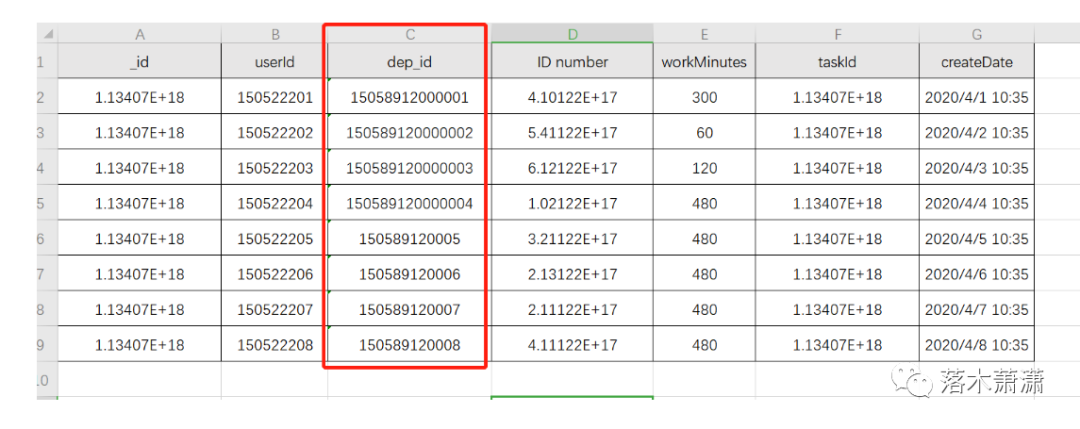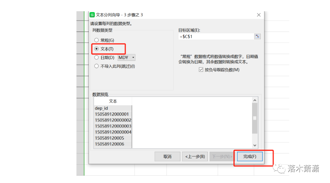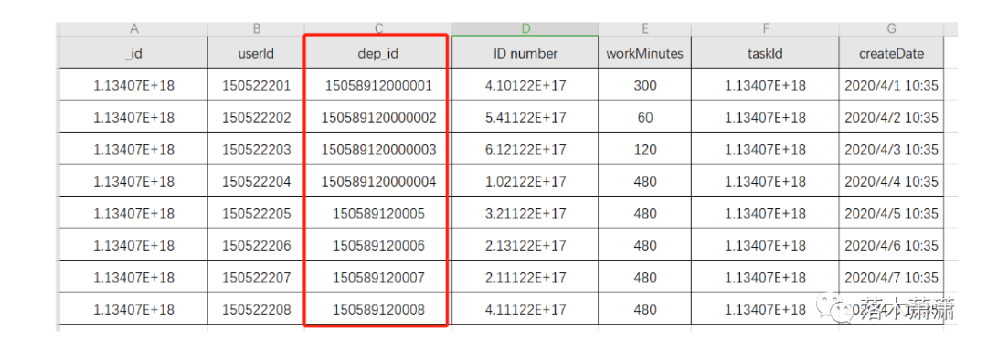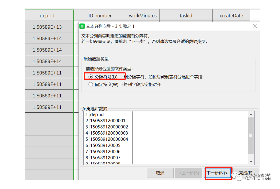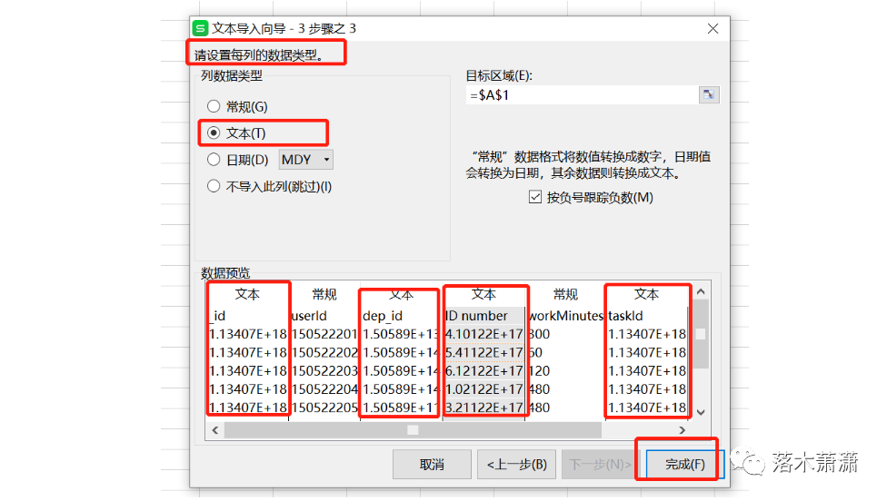 - 第六步:设置每列的数据类型,分别选中id列、dep_id列、ID number列和taskId列(这几列都是用科学计数法表示的)都设置成文本类型