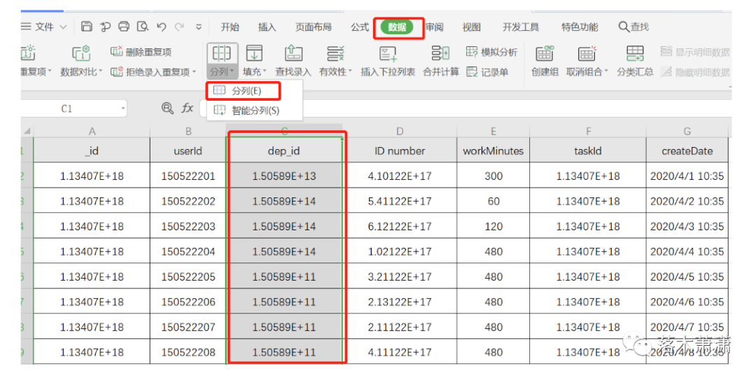以上图C列的dep_id为例(不超过15位)用分列的方法。