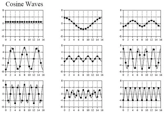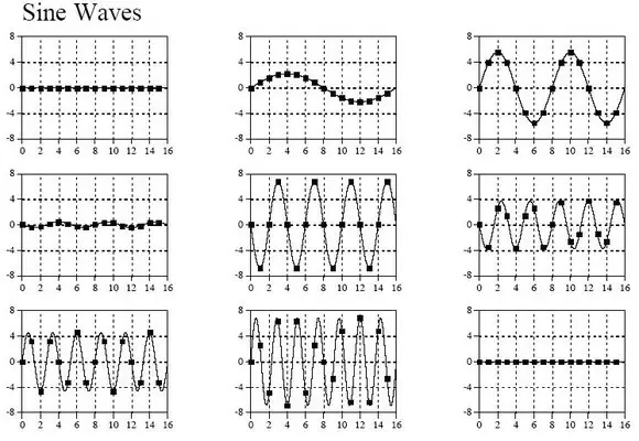 先来看一个变换实例,一个原始信号的长度是16,于是可以把这个信号分解9个余弦波和9个正弦波(一个长度为N的信号可以分解成N/2+1个正余弦信号,这是为什么呢?结合下面的18个正余弦图,我想从计算机处理精度上就不难理解,一个长度为N的信号,最多只能有N/2+1个不同频率,再多的频率就超过了计算机所能所处理的精度范围),如下图: