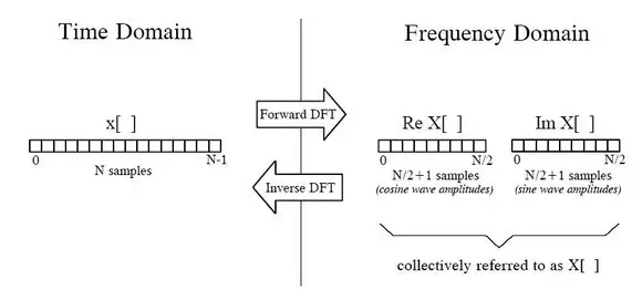 上图中左边表示时域中的信号,右边是频域信号表示方法,从左向右表示正向转换(Forward DFT),从右向左表示逆向转换(Inverse DFT),用小写x[]表示信号在每个时间点上的幅度值数组, 用大写X[]表示每种频率的副度值数组, 因为有N/2+1种频率,所以该数组长度为N/2+1,X[]数组又分两种,一种是表示余弦波的不同频率幅度值:Re X[],另一种是表示正弦波的不同频率幅度值:Im X[],Re是实数(Real)的意思,Im是虚数(Imagine)的意思,采用复数的表示方法把正余弦波组合起来进行表示,但这里我们不考虑复数的其它作用,只记住是一种组合方法而已,目的是为了便于表达(在后面我们会知道,复数形式的傅立叶变换长度是N,而不是N/2+1)。