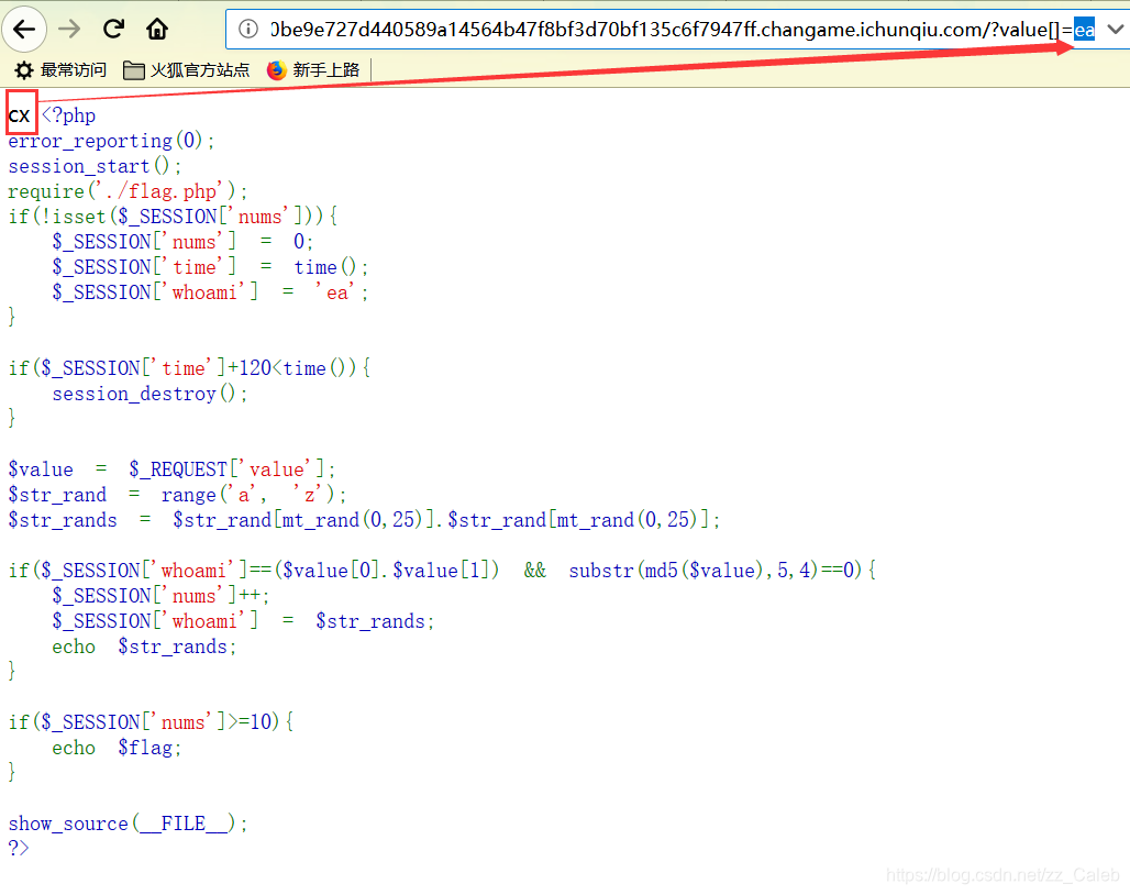 观察发现,要拿到flag需要 $_SESSION['nums']>=10,而且开头对$_SESSION['nums']赋了0值,所以要需要下面的$_SESSION['nums']++,来使$_SESSION['nums']>=10,意思就是,我们需要在$_SESSION['nums']++的循环里循环十次,所以现在的目标变成满足循环条件$_SESSION['whoami']==($value[0].$value[1]) && substr(md5($value),5,4)==0。