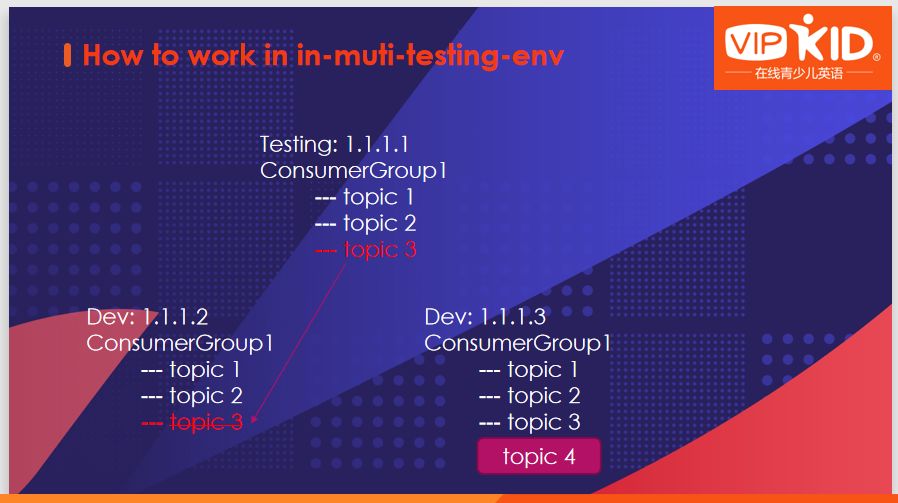 同时在测试环节,还会有一个稳定的服务提供给其他人做联调,在没有开发时需要给QA做集成测试。这个环境中称为多环境,在多环境的情况就会遇到订阅关系不一致的问题。同时,在多环境下如何做消息路由也是需要考虑的问题。