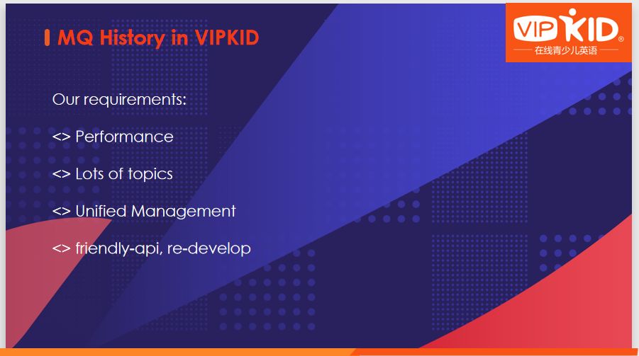 第一性能。VIPKID是贯穿北美和中国的线上英语学习机构,数据、消息量庞大,对于MQ吞吐量、延迟等有极度的要求。