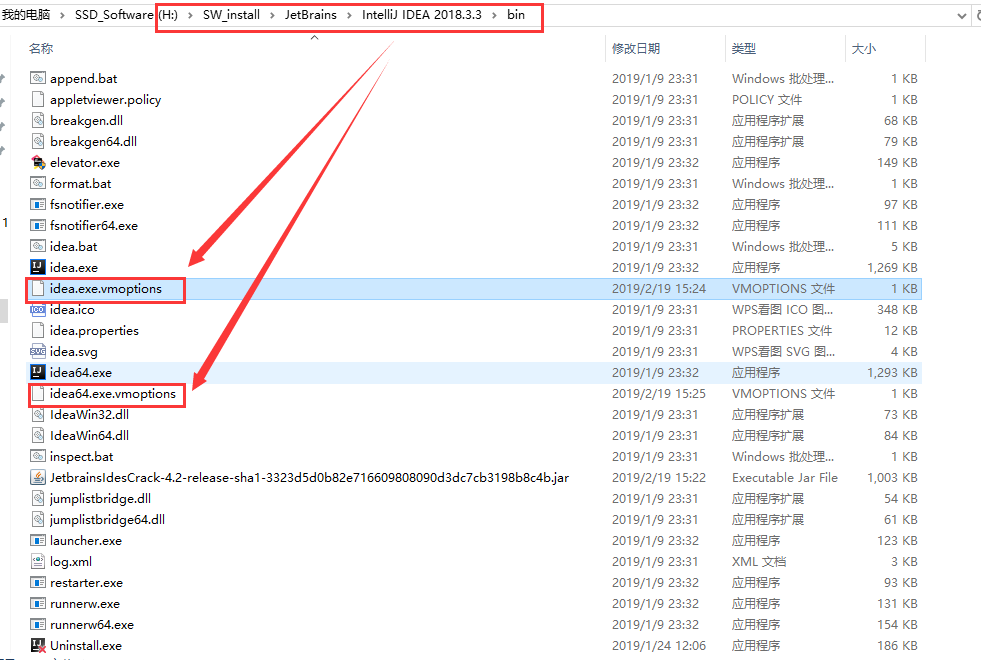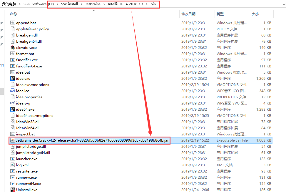 2、将下载的破解补丁jar放到IDEA安装目录的bin目录下,个人的安装目录是:H:\SW_install\JetBrains\IntelliJ IDEA 2018.3.3\