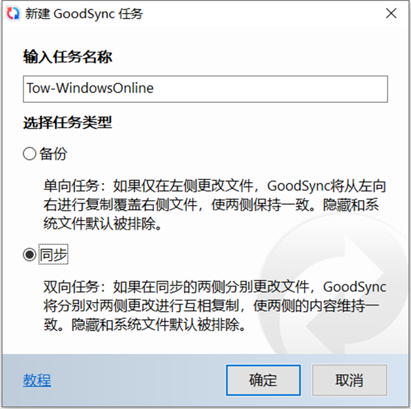 第二步:输入“任务名称”,选择任务类型,点击确定(我这里用同步举例)